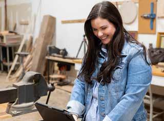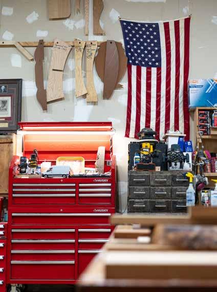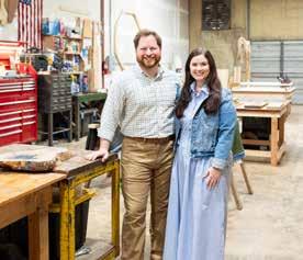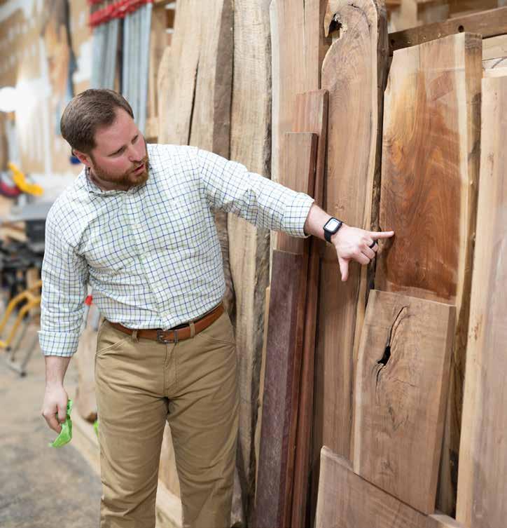 Pointing to a naturally occurring lightning boltshaped mark in one of the massive black walnut slabs at their shop, Liz says she is intrigued by the storied markings vividly displayed in the contrasting tones of darker woods like black walnut.