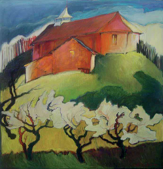 Orchard In Bloom With Red Church , 2006, oil on paper, 36” x 35”