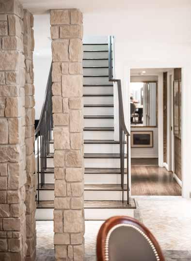 Pillars encased in limestone and a natural stone floor bring a sense of place to the foyer of this home designed by Kelly Gale Amen. Photo by Sergio Santos