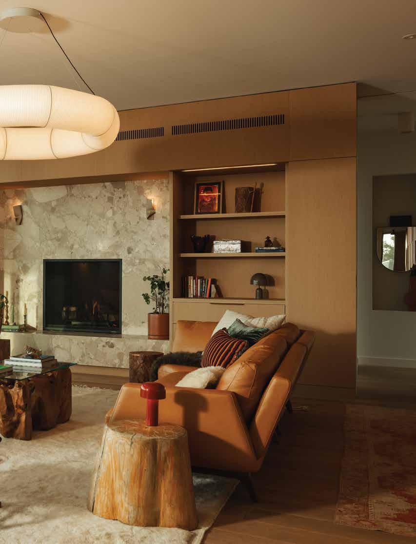 Designed as a counterpoint to the openness of the main living area, the lounge is a cocoon, both peaceful, layered, and deeply versatile. It’s a place for reading, movie nights and slow mornings. Rich tones and varied textures do the heavy lifting here, creating depth without heaviness. Soft lighting and custom upholstery make the room feel both intentional and effortless.