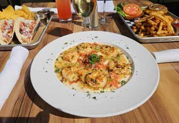 The Oly's Burger is served up smothered in sautéed onions and cheddar cheese, with house-seasoned french fries. This dish is a perfect match for game day enthusiasts. Chipotle shrimp tacos with pico de gallo, chipotle crema, and slaw serve as