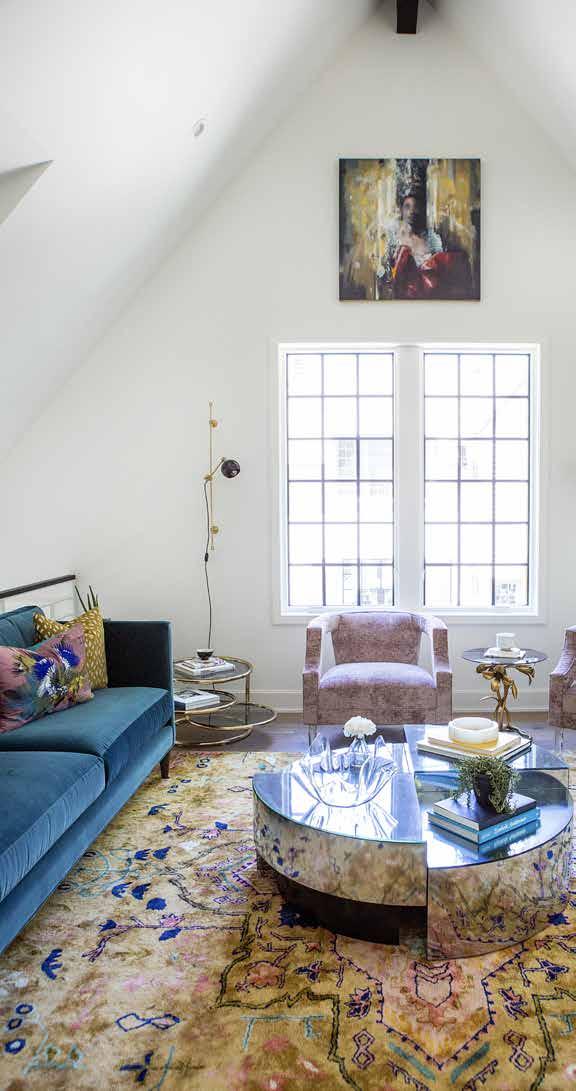 For her, designers Christy Scott Spearman and Kate Duffy created a work space and coffee bar in a bonus room above the garage. “This was lovingly dubbed the Lady Lair by the client,” says Kate. " This space was all her, the goal was to create a space for her to work in and dial into her creativity as she was writing (she's an author). She loved the feminine side of design, but also loved modern and vintage. We pulled from all of these elements to create a colorful mash up of unique pieces that resulted in a colorful rug, custom seating, original artwork, and vintage tables. The rest of the home leaned more into modern clean design, with a few key ‘moments’ here and there featuring stunning artwork and a few antiques from their personal collection."