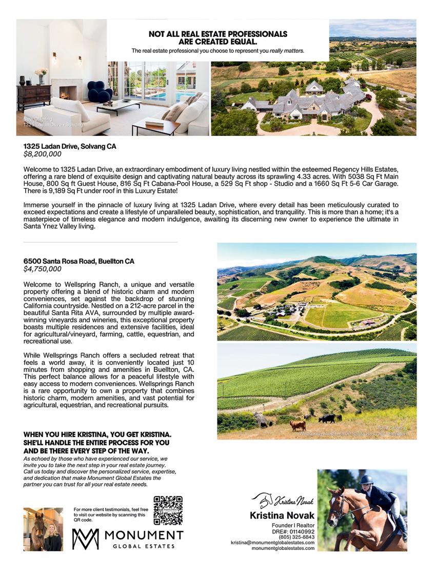 Nestled in the serenity of the Santa Ynez Valley, where the rolling hills meet the azure skies, resides a community that embraces great wine, hard work, and the art of savoring life’s pleasures. The equestrian culture in the SYV runs deep and strong, with Kristina Novak, founder of Monument Global, serving as a beacon of passion for animals, a business owner, an avid equestrian, and a beloved member of our local community.