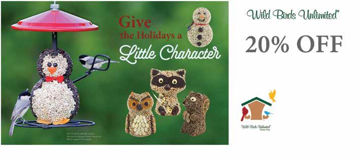• Seed characters and ornaments; whimsical seed cylinders shaped like owls or other animals ready to hang and attract a wide variety of birds.