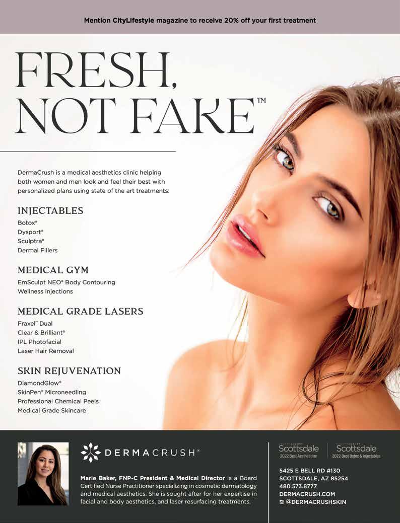 Local expertise you can trust. 1 0 6 0 75 3 3 Frank Schubert 480-515-6259 8787 E. Pinnacle Peak Rd., Ste. 120 Scottsdale, AZ fschubert@allstate.com Personalized service. Trusted advice. As your local Allstate Agent, I understand the unique coverage needed for the homes and cars in our community, and which coverage you may not need. You could say I’m an expert at getting you the protection you want with the savings you deserve. Call, email or stop by my office for a free quote today. Subject to terms, conditions and availability. Savings vary. Allstate Fire and Casualty Insurance Co.© 2018 Allstate Insurance Co. www.scottsdale bodysculpt.com A revolutionary device to restore, tone and sculpt the body. ( 520 ) - 904-0737 8734 E Shea Blvd #101 Scottsdale, AZ 85260 • Decrease Cellulite • Stimulates Collagen Production • Enhance Lymphatic Drainage • Decrease Aches & Pain • Improve Blood Flow • Increase Muscle Tone • Decrease Inflammation • Great for supporting post-Covid recovery Where Health & Wellness Meets Beauty 41 | CITYLIFESTYLE.COM/SCOTTSDALE AUGUST 2023