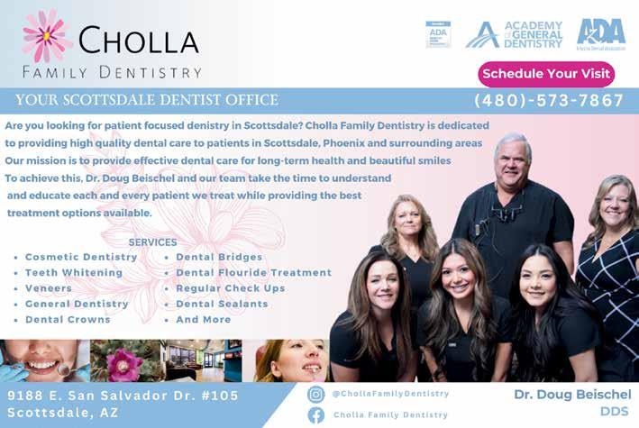 CITYLIFESTYLE.COM/SCOTTSDALE LIFESTYLE LETTER Scottsdale City Lifestyle™ is published monthly by Lifestyle Publications LLC. It is distributed via the US Postal Service to some of the Scottsdale area’s most affluent neighborhoods. Articles and advertisements do not necessarily reflect Lifestyle Publications’ opinions. No portion of this magazine may be reproduced in any form without written consent. Lifestyle Publications does not assume responsibility for statements made by advertisers or editorial contributors. Information in Scottsdale City Lifestyle™ is gathered from sources considered to be reliable, but the accuracy of all information cannot be guaranteed. Proverbs 3:5-6 PUBLISHER Alicia Haygood | alicia.haygood@citylifestyle.com EDITOR Michelle Glicksman michelle.glicksman@citylifestyle.com ADMINISTRATIVE DIRECTOR Faith Morello | faith.morello@citylifestyle.com CONTRIBUTING WRITERS Alison Bailin Batz, Angel Fuchs, Rebecca L. Rhoades, Georgann Yara CONTRIBUTING PHOTOGRAPHER Sophia DuBois March 2024 Visit our Instagram Corporate Team CHIEF EXECUTIVE OFFICER Steven Schowengerdt CHIEF OPERATING OFFICER Matthew Perry EXECUTIVE DIRECTOR OF HR Janeane Thompson DIRECTOR OF FIRST IMPRESSIONS Jennifer Robinson TECHNICAL DIRECTOR Josh Klein AD DESIGNER Josh Govero LAYOUT DESIGNER Andi Foster Learn how to start your own publication at citylifestyle.com/franchise. 8