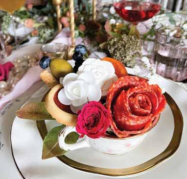 At the heart of this spectacular spread, a bouquet of floral offerings takes center stage featuring assorted chocolate florets, delicate white rose wafers, and salami and cheese blossoms. Perfectly crafted and delicious, they establish the visual and gastronomic theme for the entire display. Accompanying the spread are glasses adorned with edible floral rims, beckoning you to sip and savor the essence of spring; dried lavender, marigold, rose, lemon peel and lily garnishes provide vibrancy and are entirely edible. Elevate the visual appeal with rosefolded napkins and a sprinkle of seasonal flowers atop layers of fresh greenery.