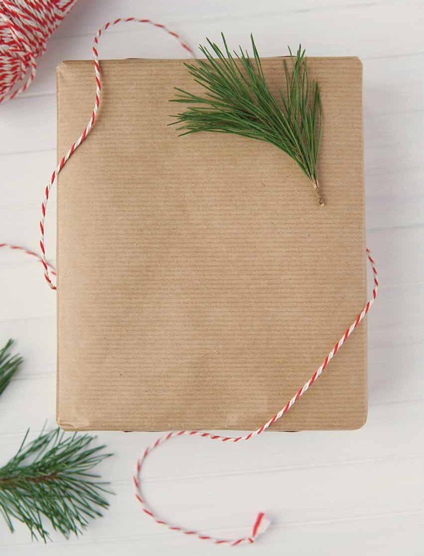 For gifts with a rustic, organic feel, use seasonal accents, such as sprigs, pine cones and cinnamon sticks, tied up with twine, encircling recycled paper for the wrapping.