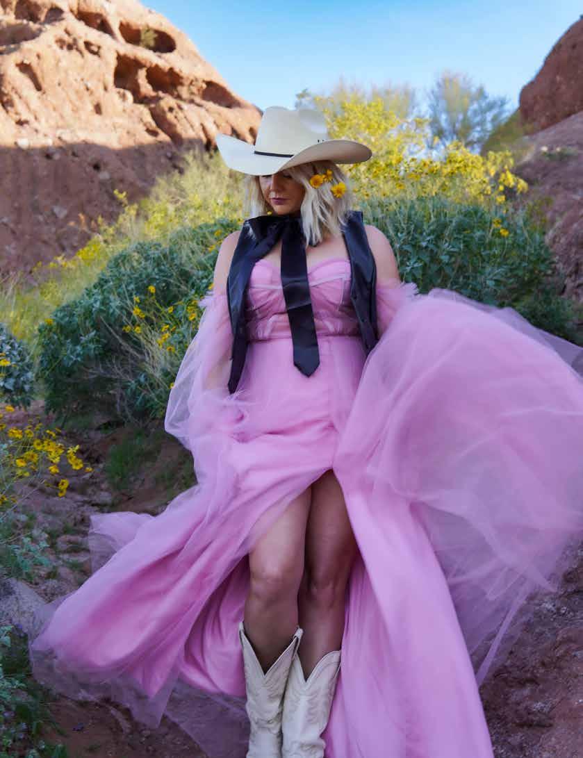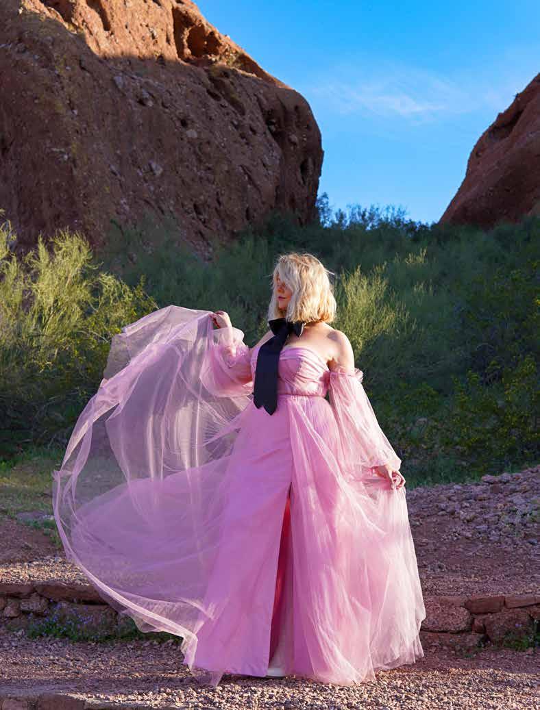 Bathed in the golden light of sunset, Lauren Miller radiates warmth and elegance, embodying the spirit of Hive Interiors amidst the breathtaking landscape of Papago Park.