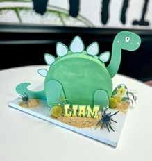 Strawberry cake with vanilla buttercream, decorated in vanilla buttercream, custom acrylic pieces for the name, dinosaur spikes, and head.
