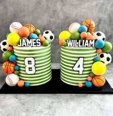 Chocolate cakes with chocolate mousse, decorated with vanilla buttercream in green and white, custom name and age pieces, and foam sports balls.