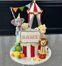 This circus cake is vanilla flavored with mixed berries and cream, decorated in buttercream frosting with custom fondant décor pieces.