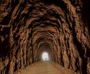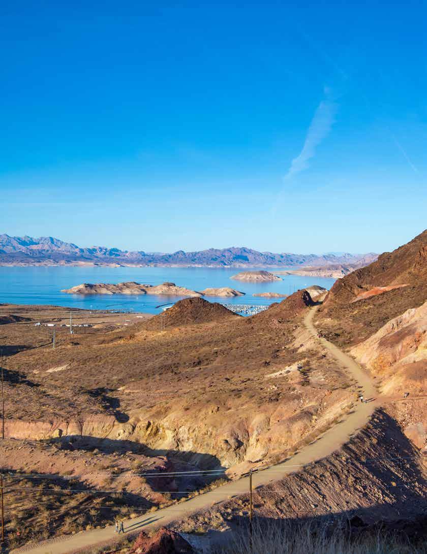 The Historic Railroad Trail is a wide and leveled trail along an abandoned railroad bed with five short tunnels and great views of Lake Mead. The trail traverses and tunnels through volcanic rocks, the same as those underneath Hoover Dam. The firm surface of crushed granite provides stability for rolling wheelchairs, biking, and hiking for 2.4 miles each way. Dogs are always permitted to hike along, but there is no shade except in the tunnels, so this trail is not recommended during the hot summer.