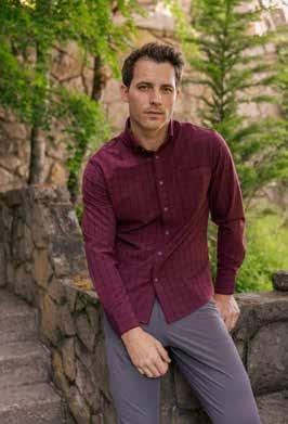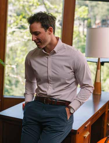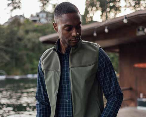 “EVERYTHING WE MAKE FEELS LIKE YOUR FAVORITE ATHLETIC GEAR, AND GUYS JUST LOVE BEING COMFORTABLE.”Leeward no-tuck dress shirt in navy Dallas plaid ($138), Venture vest in sage solid ($168) & Helmsman 5-pocket pants in khaki solid ($138) Nolan knit shirt in coastal fjord ($158) and Helmsman 5-pocket pants in black solid ($138)