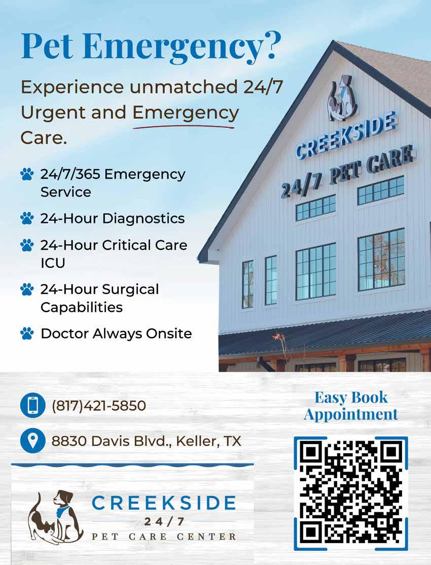 Creekside Pet Care Center is a full-service 24/7 Keller/Southlake-area veterinary hospital with onsite grooming, daycare and boarding services. Creekside’s veterinary services are available 24 hours a day, seven days a week, with a state-of-the-art emergency care facility. Creekside’s professional and courteous healthcare team aspires to excellence in medical treatment, quality and client service, utilizing cutting-edge knowledge, equipment and techniques to care for pets and exceed their families’ expectations. The Creekside family loves pets!