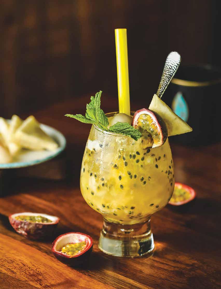 Garnish with slice of passion fruit, pineapple and mint sprigs.