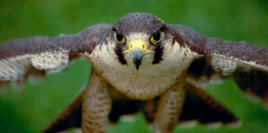 Peregrines are cliff-dwellers, and have adapted to life on tall buildings and bridges. Breeding pairs usually mate for life. When hunting, peregrines dive on their prey at speeds 200-plus mph, making them the fastest animals on Earth.