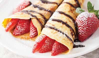 Fill crepes with strawberry filling and roll up. Top with sliced fresh strawberries, powdered sugar, and a drizzle of melted chocolate and serve. Add whipped cream, other berries and bananas as desired.
