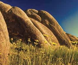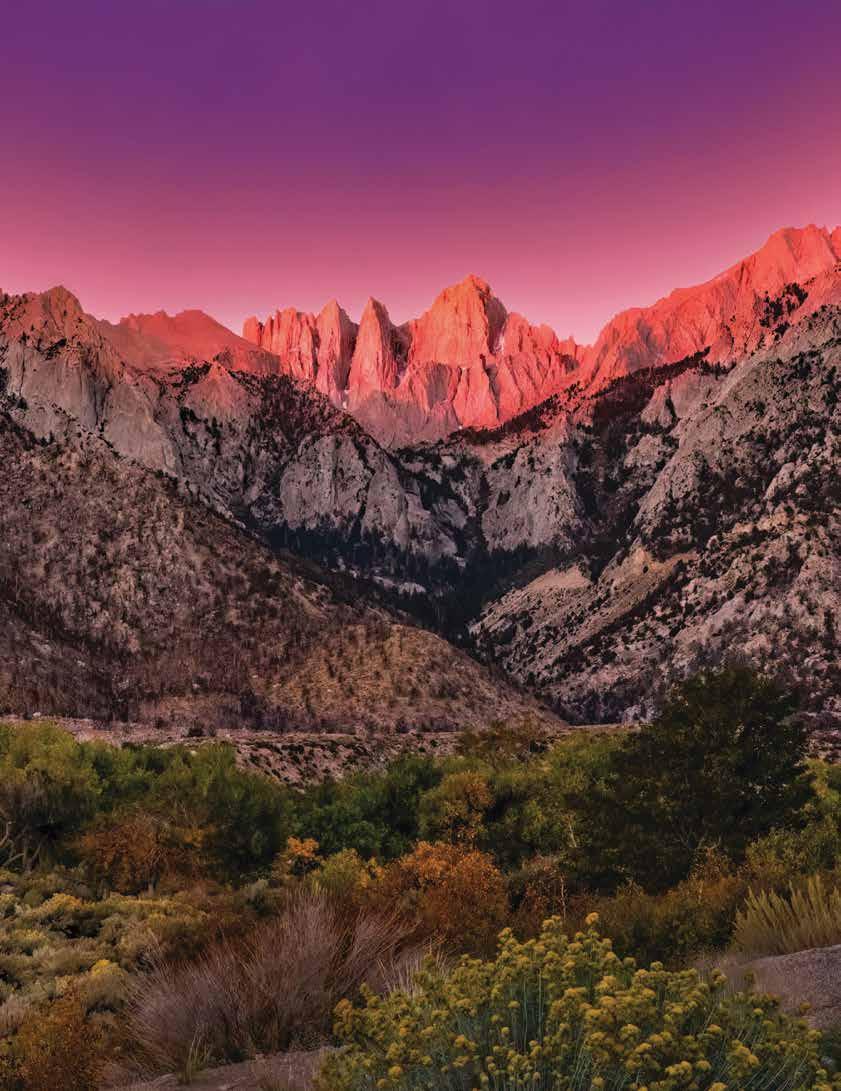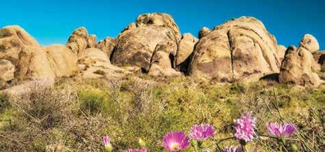 The valley landscape is a mix of massive and uniquely shaped outcroppings of rugged metamorphosed volcanic rock, layered among oddly rounded sandpaper-like boulders made of biotite monzogranite. This terrain is overshadowed by the jagged, angular peaks of gray granite that form Mt. Whitney and the Sierra Nevada Mountain range. These timeless rock outcroppings and mountains were created millions of years ago and serve as a backdrop, towering over fields of fragile wildflowers that appear and disappear from spring through fall.