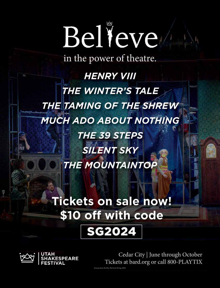 Utah Shakespeare Festival is held in Cedar City in three grand theaters. Plays in 2024 include “Henry VIII,” “The Winter’s Tale,” “The Taming of the Shrew,” “Much Ado About Nothing,” “The 39 Steps,” “Silent Sky,” “The Mountain Top” and the Royal Academy of Dramatic Art 2024 Production. For tickets and times, visit bard.org