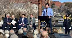 Mayor Jimmie B. Hughes cuts the ribbon for the opening of St. George's City Hall. Mayor Hughes, "We have never been shy and we've always been proud to recognize our heritage and pioneer history...here in St. George, our dreams of the future always match and respect the legacy of our past." Naghi Zeenati and John R. Willis gave remarks with a dedicatory prayer offered by Elder Steven E. Snow.