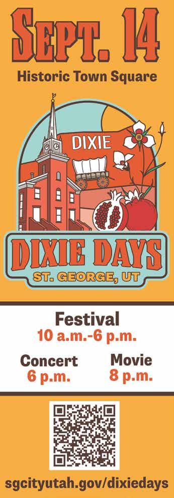 Heritage Days will be held at Ivins City Heritage Park on Friday and Saturday, Sept. 6 and 7. The theme is “Ignite Your Community Spirit!” Events include a parade, pie baking contest, live local entertainment, vendors, children’s games, mini-miss pageant, pony rides, family games, crafts, an art exhibit, climbing wall, Bingo and so much more. For information, contact ivinsutah.gov/heritage-days.