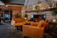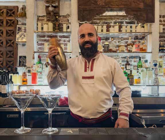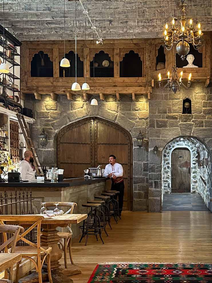 seating area, a beautiful outdoor patio and a gorgeous bar that seats five. When you enter the restaurant, you are struck by the stone walls, arched doorways, massive wooden doors, wood beam ceilings, wrought iron railings, chandeliers and old-world artwork dotting the walls.