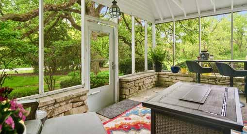 A three-season room and wide screened porch look out at the pool and heritage trees.