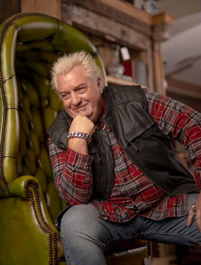 Derrick Spain’s electric blue Harley sits in the courtyard of his “Reclaimed Leather”, store in Old Town Spring, accessed through a heavy fortress door we step back in time to the aroma of real wood and leather, it’s like entering a hidden speakeasy. With a penchant for British antiques, and a particular love of the Chesterfield sofa, Derrick has created an intriguing business with an old-school twist. Having a naturally strong design aesthetic, his vignettes presented around the store, are comparable to a luxury interior atelier. A Le Corbusier cow hide chair sits quietly, while a rare, refurbished green leather porter’s chair guards the entrance. Each piece has its own story and Derrick knows every one of them.