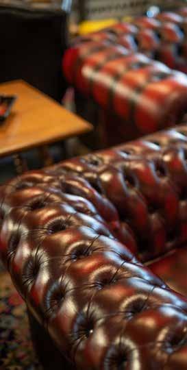 When a Chesterfield arrives, the restoration begins. After reworking the padding and legs, Derrick refinishes the original leather with his magic touch! Nicknamed “The Leather King” by his UK supplier, he has honed his craft to an exemplary level. After experimenting with hand dying, he eventually trained overseas in leather refinishing. Achieving the intensity of color on a piece is an acquired skill. These button-backed sofas have an aged depth of color around the button indentations, which is difficult to execute. Popular colors move with the trends, but traditional emeralds, reds, blues and browns remain in constant favor. Using the original leather keeps a soft smooth feel, but with a strong resilient finish.