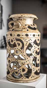 The “Paradox of Containment” vessels, include obsolete milk churns and oil cans, with lace like patterns cut into the body of the containers, creating holes in something designed to hold and preserve liquids, transforming these abandoned functional items into fine art pieces with a narrative. The shadows created when light shines through the multiple elegant cutouts are as beautiful as the physical item, with a play on shadows cast, and positive and negative spaces — another paradox.
