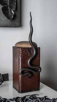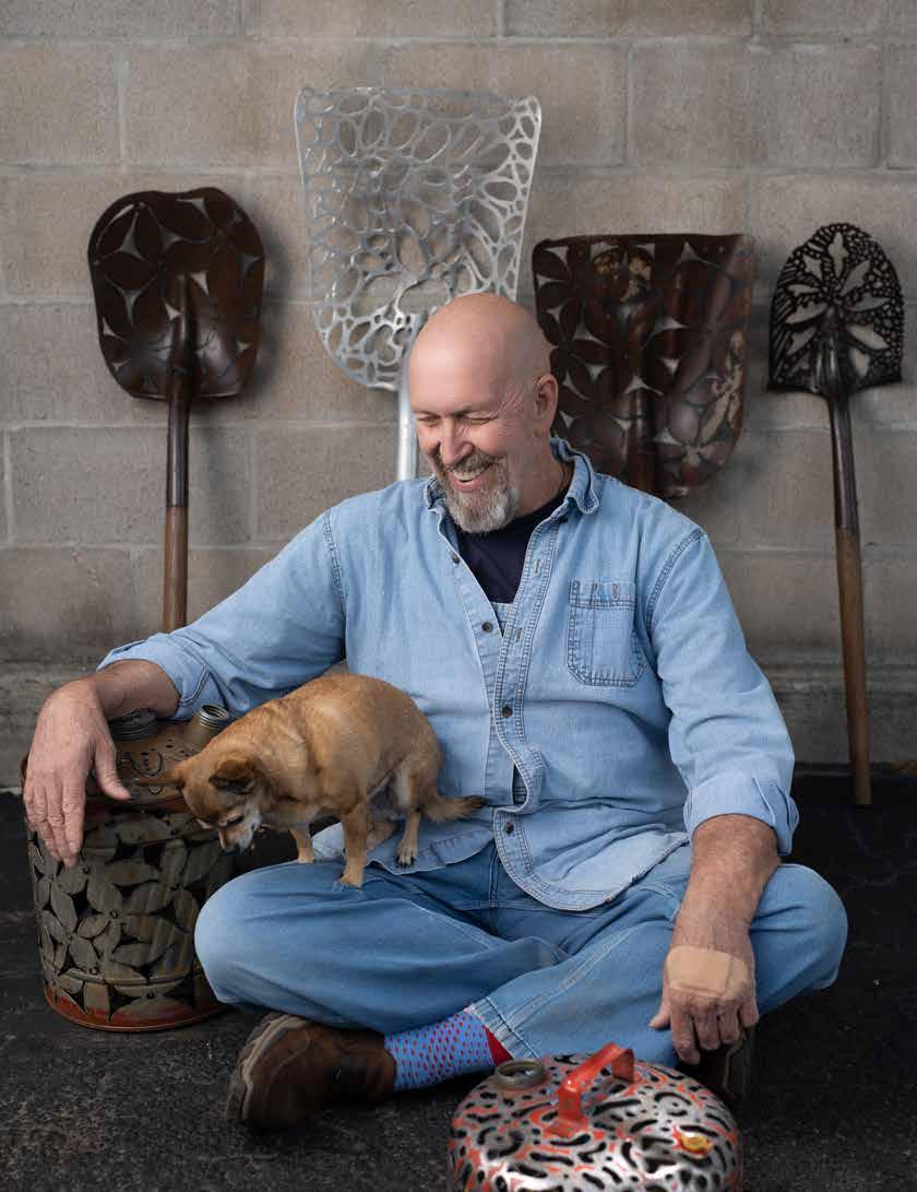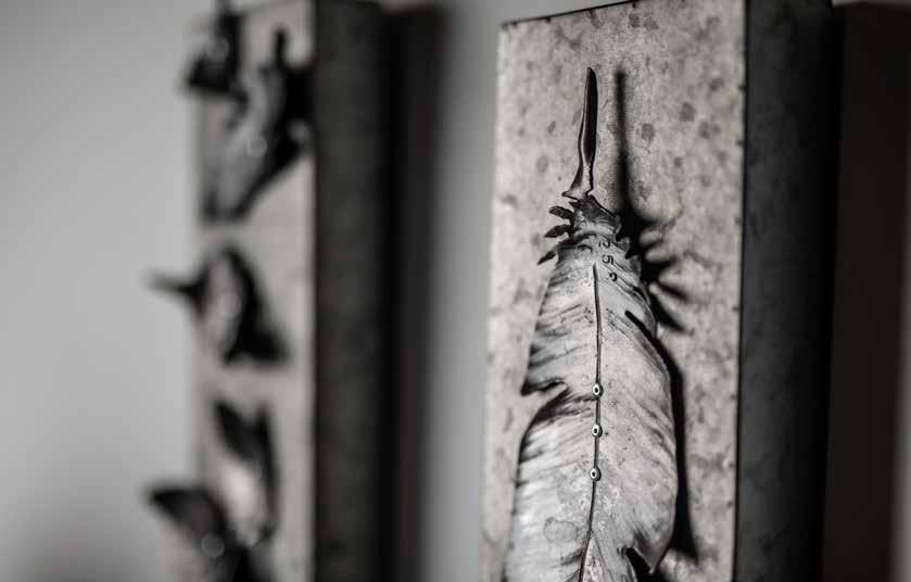 Tools of choice include a plasma cutter, oxygen acetylene torch, and blacksmithing equipment including an anvil, propane, and coal forge. With these heavyduty means, he can create filigree designs on the most unforgiving, hard materials. Pretty florals and fragile feathers emerge, as intricate shapes are cut and formed from discarded farm equipment, oil cans, shovels, rakes and other metal utilitarian basics. Once again, we see a contradiction in his work, the softness and femininity