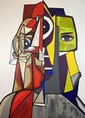 His new work explores this concept of psychological cubism, where emotions are presented in the painting “Inside Outside”. Named after the Disney movie, “Inside Out”, this painting depicts the reflection of his subject looking in a mirror, their innermost thoughts and feelings on one side, and their multiple personas on the other, one side is smiling and the other is distraught. The bold colors reflect this contrast, cool and calm blues and greens on the “outside” and red, fragmented shapes on the “inside”, where multiple eyes stare and judge as harshly as one can only judge oneself.