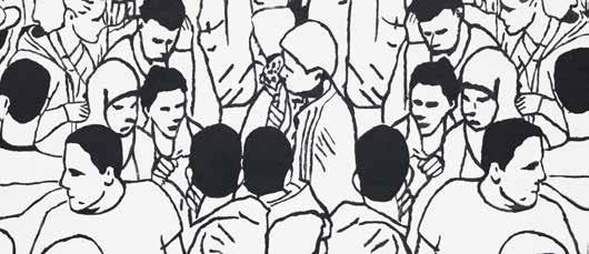 “Déjà Vu”, a black and white piece is a companion work for “Sonder”, being negatives of each other, representing the inside and outside personas. In “Déjà vu”, the composition focuses on a split mirror image, bold, black painted lines on a white background, strong, precise, lost and found lines in varying thicknesses create depth, shapes and shadows, the disconnected crowd, lost in their own beings. Included in the same oeuvre is “Sonder”, the title inspired by the “Dictionary of Obscure Sorrows” by John Koenig, defined as – “Sonder: The profound feeling of realizing that everyone, including strangers passing in the street, has a life as complex as one’s own, which they are constantly living despite one’s personal lack of awareness of it.”. “Sonder” is painted with white on black, loose lines, connecting with each other, overlapping with a friendlier, softer feel. Perhaps one depicts our personalities during the day compared to nighttime? Perhaps they represent our innermost and outermost selves? Perhaps they are attributed to the left and right sides of the brain?