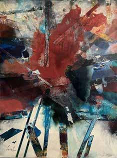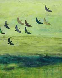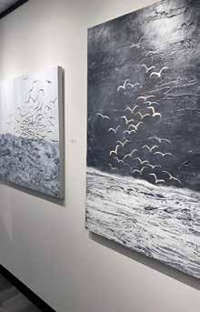 1: Annette Palmer’s art is shown at her “Across the Pond” exhibit presented by The Woodlands Arts Council. Her art is representative of her native Scotland and her home in Texas. 2: Annette and her daughter Faith and husband Bob. 3: The grays of the Scottish sea 4: Colors and landscapes of Annette’s Scottish homeland are found in several pieces of art 5: “Flying, Floating, Falling” Acrylic on canvas 6: Kelly Blum, Annette Palmer and Ginette Mailloux 7: The “Goose’s Acre” Acrylic on canvas