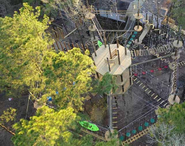 Get a bird's-eye view of The Woodlands this summer by ziplining at Texas TreeVentures, an aerial adventure course adjacent to the George Mitchell Nature Preserve. A safety orientation is provided at the start, and a reservation time is included in the three-hour adventure, which involves scaling staircases and resting on platforms between the stations. Even if you don't feel daring, you'll be safely clipped into a marked route and can cruise along at your own pace. The zipline course is designed to be a "challenge by choice" to pick and choose how you want to scale the heights. It's a popular summer family, corporate, and date venue so online reservations are encouraged. While the course is designed for everyone's enjoyment, children from six to eight years of CONTINUED >