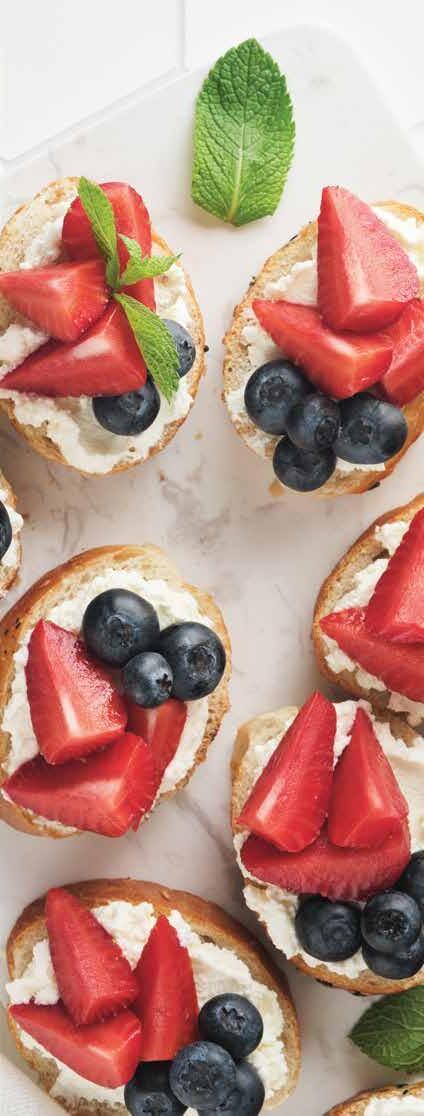 6. Add sliced strawberries and a few blueberries, allowing the vibrant colors to pop. (A great place to find fresh fruit is our local staple, Crystal & Rich’s Produce.)