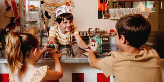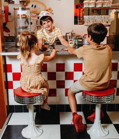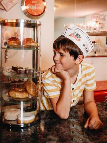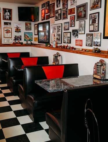 The floor is a black and white checkered pattern, and near the 50s style leather booths with stainless steel edges is what looks like a 40s or early 50s style jukebox. “It has more modern electronics, but still has the bubbles that change colors,” says Todd. Inside, there are classic 45 rpm records from the 40s, 50s and 60s.