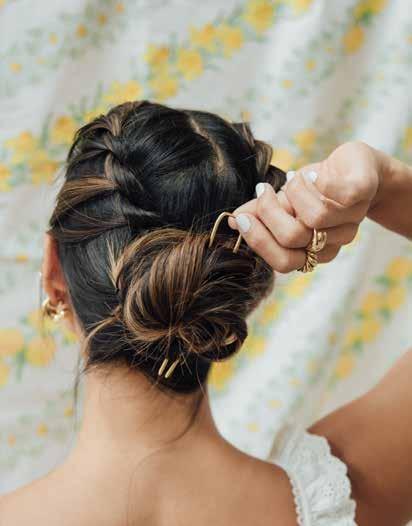 Part the hair down the center or side part, if preferred. Create braid(s) on the side of the head and secure with elastic. Twist the hair with braids into a simple bun, securing it with hair pins. Add an accessory for a classy touch.