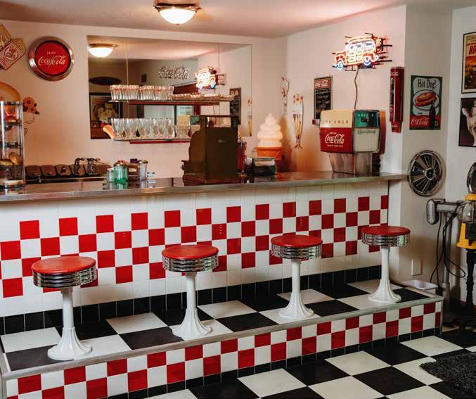 In Todd’s basement, he created a replica of a 1950s diner complete with a soda fountain bar with stainless steel soda fountains and round red stools, malt machines, and an old Coke machine. “We also have what’s probably a 1940s era movie theater popcorn machine that has the really neat little lights in the top,” he says.