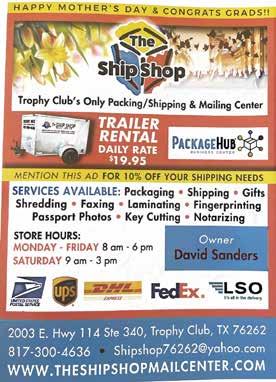 GIFT GUIDE | ENTERTAINMENT 06 07 HAVE A PIZZA PARTY Everyone loves pizza. Make or buy some premade pizza dough and put different toppings in bowls and have Dad and the kids decorate it! MAKE A TIME CAPSULE Dig a hole in your backyard and have Dad help the kids gather items around the house (like a current newspaper or flyers) and put them in a waterproof bag. HAVE FONDUE FOR DINNER Fondue is a blast and fondue pots are back in style! Get yourself a fondue pot and find fondue recipes online or create your own and have a dinner experience Dad will never forget! 08 Trophy Club’s Only Packing/Shipping & Mailing Center Shipping • Gifts Fingerprinting Notarizing Owner David Sanders 2003 E. Hwy 114 Ste 340, Trophy Club, TX 76262 817-300-4636 • Shipshop76262@yahoo.com WWW.THESHIPSHOPMAILCENTER.COM TRAILER RENTER DAILY RATE $19.95 HAPPY MOTHER’S DAY! 10% OFF SHIPMENTS IN MAY NOW HIRING PART TIME HELP 9AM - 4PM BE YOUR OWN BOSS SET YOUR SCHEDULE LOW FRANCHISE FEE WORK-LIFE BALANCE DO YOU REALLY HAVE TO CHOOSE? Franchising with us means making money and time for your life. START YOUR OWN PUBLICATION CITYLIFESTYLE.COM/FRANCHISE « 30