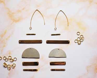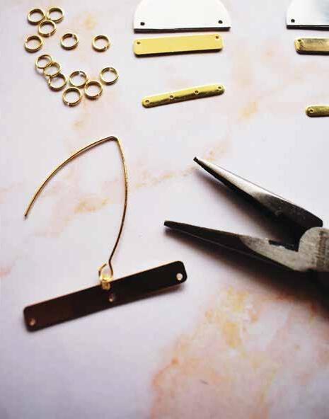 Take your half-circle stamping blanks, large gold bars and medium gold bars and arrange them in the order you want your earrings to flow. You can see how we arranged ours, but consider switching up the placement of each item for varying earring styles.