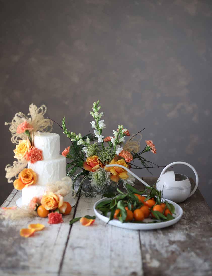 Stuck with broken, leftover blooms from creating your floral bowl arrangements? Don’t discard those flowers just yet! Simply arrange leftover blooms and a few ornamental grasses onto a cake to elevate any tablescape. Even though the blooms are arranged out of water, they will look fresh for hours (especially when using roses and carnations). Enjoy!