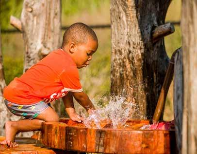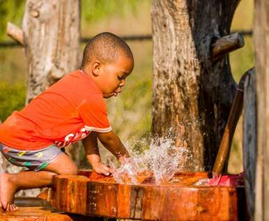 Young learners love to explore hands-on by getting a little wet. This outdoor classroom designed by Good Fieldwork and built by Jonesplan includes lots of interactive water play. It features a bamboo aqueduct that is fed by a child-operated pump, a waterfall that spills into a boulder creek, ground sprayers on a flagstone patio, a drive-thru water element, and a nature-based water table made from and fed by harvested cedar tree trunks.