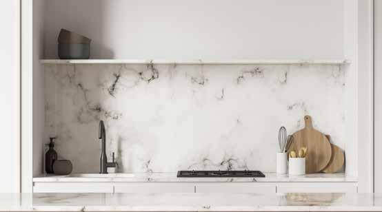 Gorgeous stone backsplashes and added shelving are on-trend for kitchens.