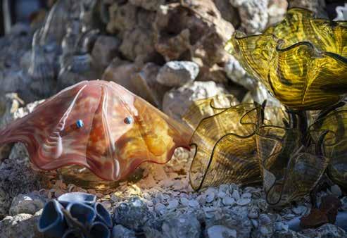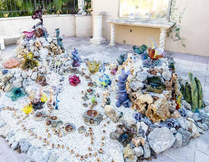 Alan Keck, master potter and ceramics teacher at the Venice Art Center, has conjured up a fantastical underwater scene from millions of years ago with blown glass, clay, porcelain, shells, fossilized rocks from the cretaceous period, and more. A variety of vivid creatures and delicate details bring the reef to life. Blue and teal tube worms with flowing tentacles emerge from the ocean floor; yellow, green, and amber-tinted clams sporting rattlesnake tails mingle with sprawling octopi; and a sleek, mottled orange stingray rests among the rocks. Alan named his creation From an Ancient Seabed , after the tallest portion of the installation from which a burgundy clam emerges, surrounded by colorful barnacles and twisted seagrass. This area also contains the earliest pieces Alan crafted in 1992 in Emporia, Kansas where he taught ceramics and glassblowing at the local high school.