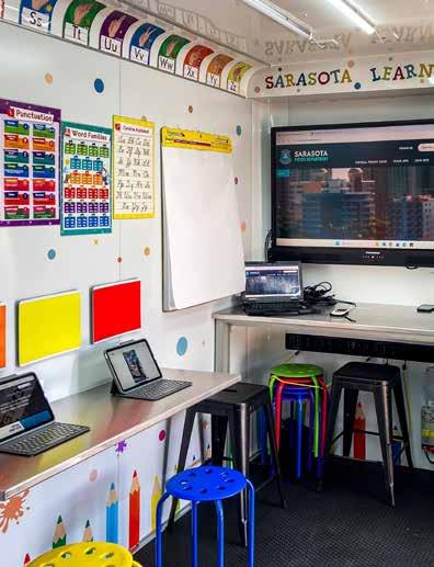 The fully equipped mobile classroom was created by the Sarasota Police Department’s Community Relations Unit. It is stocked with iPads, a smartboard, classroom supplies, satellite internet, a 3D printer and over 200 books. Funded through a philanthropic