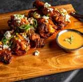 O&S wings are slow roasted in the stone oven, then tossed with one of six signature sauces. Shown here: OG Buffalo Wings served with bleu cheese crumbles, green onions, and ginger honey mustard. 19795 Wellen Park Blvd., Suite C, Wellen Park | oakandstone.com/ location/venice-wellen-park
