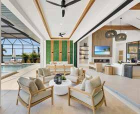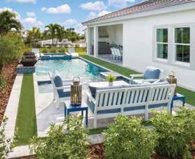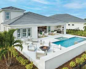 Outdoor areas in Homes by WestBay’s EVERLY models include covered lanais with kitchens, dining and living areas and open-air firepits. Wall-spanning glass sliders open the great room and kitchen of the twostory, four-bedroom Biscayne II to the outdoors. The pool has a sun shelf with a bubbler and steppingstones on each side of the raised spa. The two-story Gasparilla II, also with four bedrooms, features grassy areas and a restful coastal palette of blues and whites, echoed in furnishings and the mosaic tile of the raised spa and a trio of columns, each with bowls combining fire and sheer water descents.