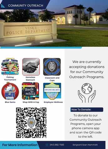 programs he oversees. “To donate to our programs scan the QR code in the ad on page 29,” he explained. The web page venicegov.com/government/police/community-programs will appear, where donations are now accepted even by credit card. Hammett explained, “A lot of people don’t know about our programs and this platform provides the opportunity to become more informed and, if so inclined, to make a donation.”